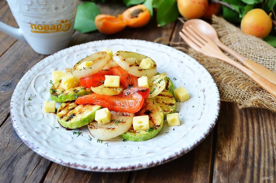 Салат подойдет для сытного обеда, витаминный арсенал паприки и кабачка насытят человека на целый день, наполнив его организм полезными микроэлементами, среди которых витамины группы С, кальций, фолиевая кислота.