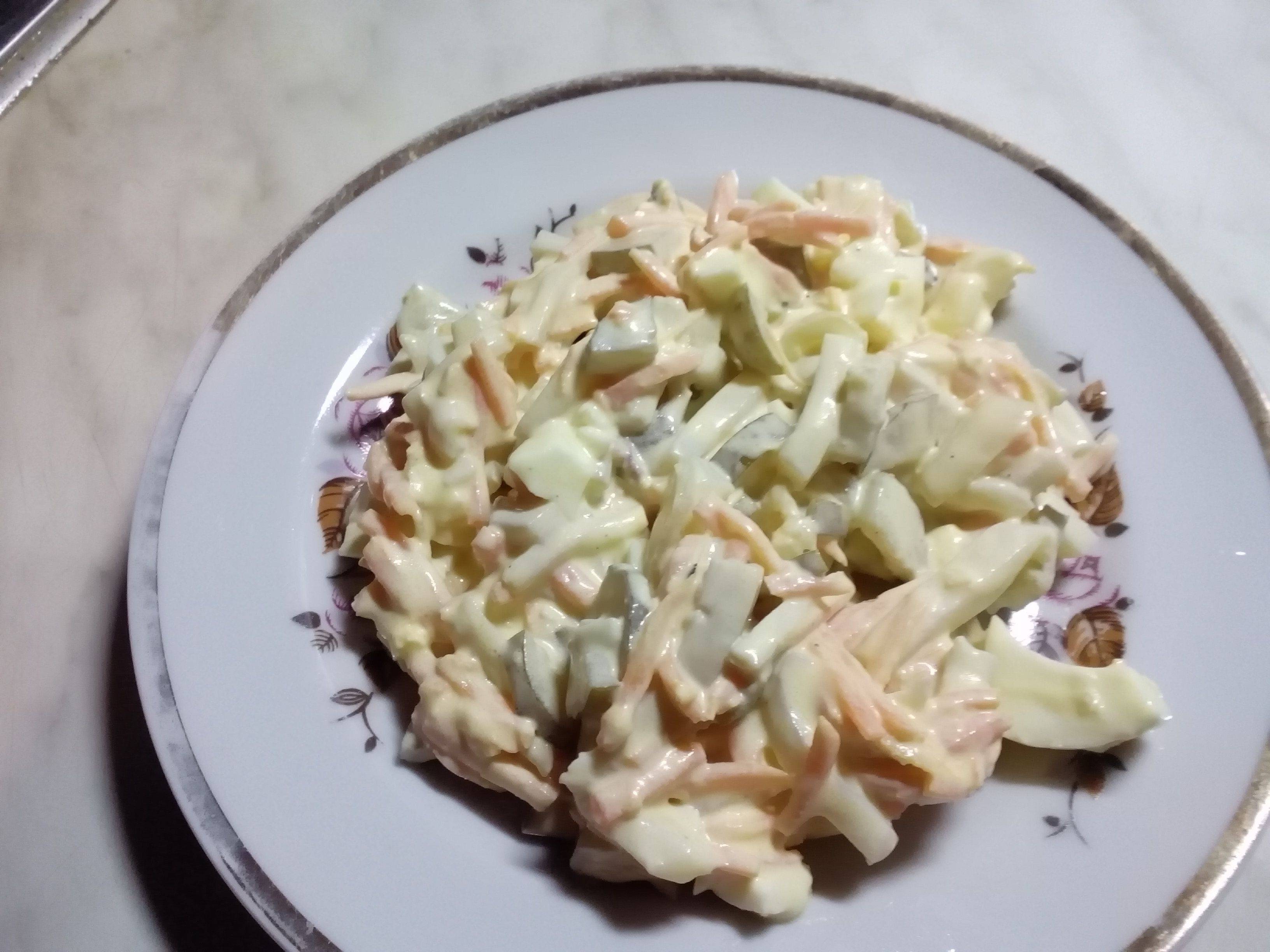 Простой салат из кальмаров с кукурузой и крабовыми палочками