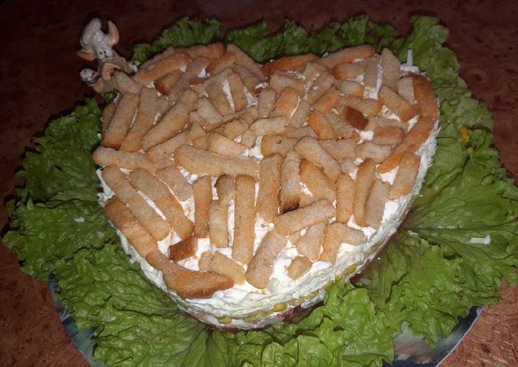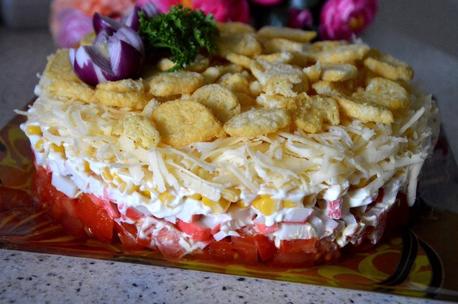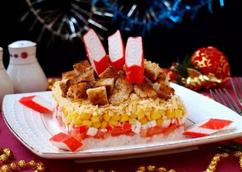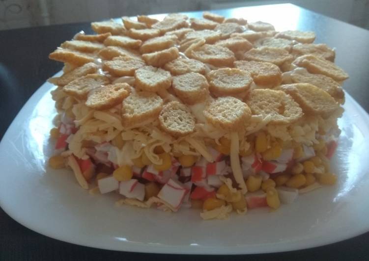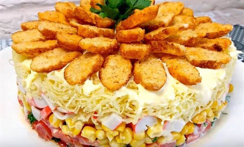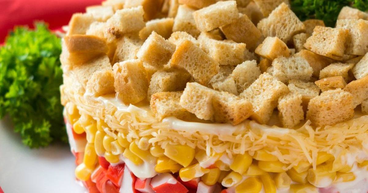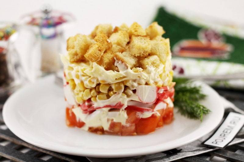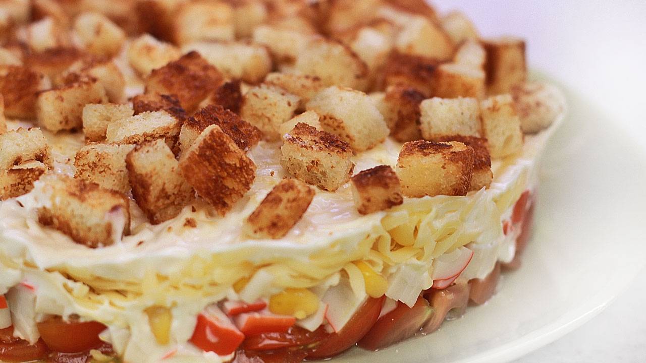 Многие не любят крабовые палочки, так это не проблема, просто замените их на любую рыбу без мелких косточек или даже на мясо. Сухарики можно взять как пшеничные, так и ржаные, это уже дело вкуса.
