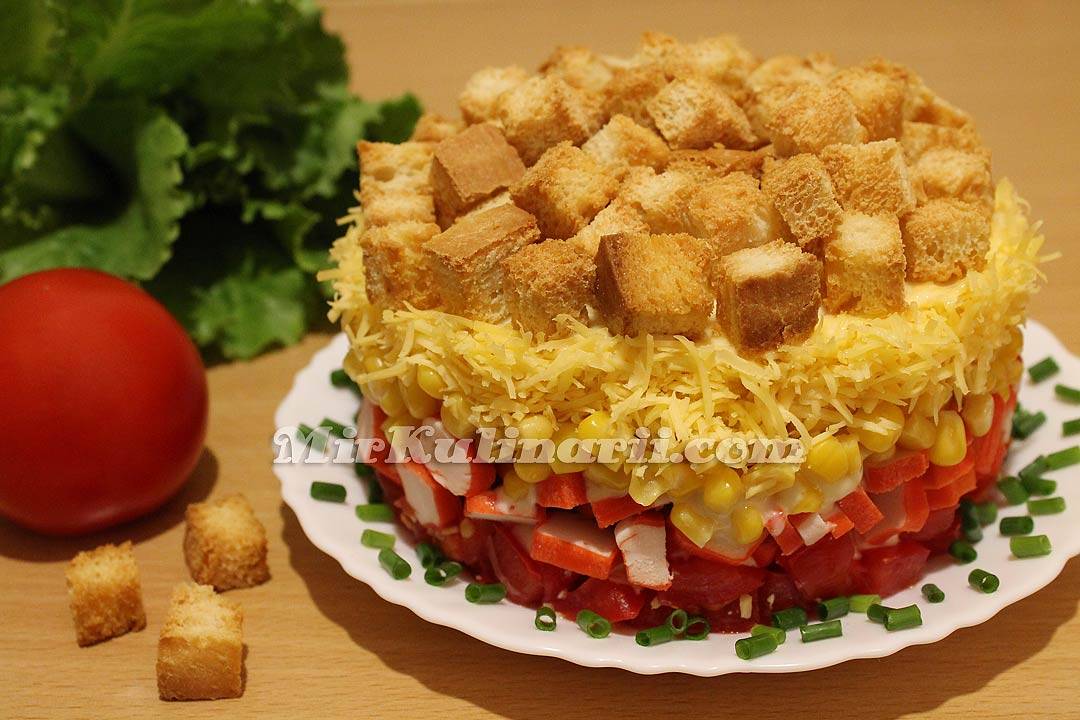 Порадуйте себя и своих домашних простым и интересным салатиком из крабовых палочек с помидорами и кукурузой. Если вы хотите, чтобы салатик был особенно легким, то вместо сухариков сделайте нежные греночки.