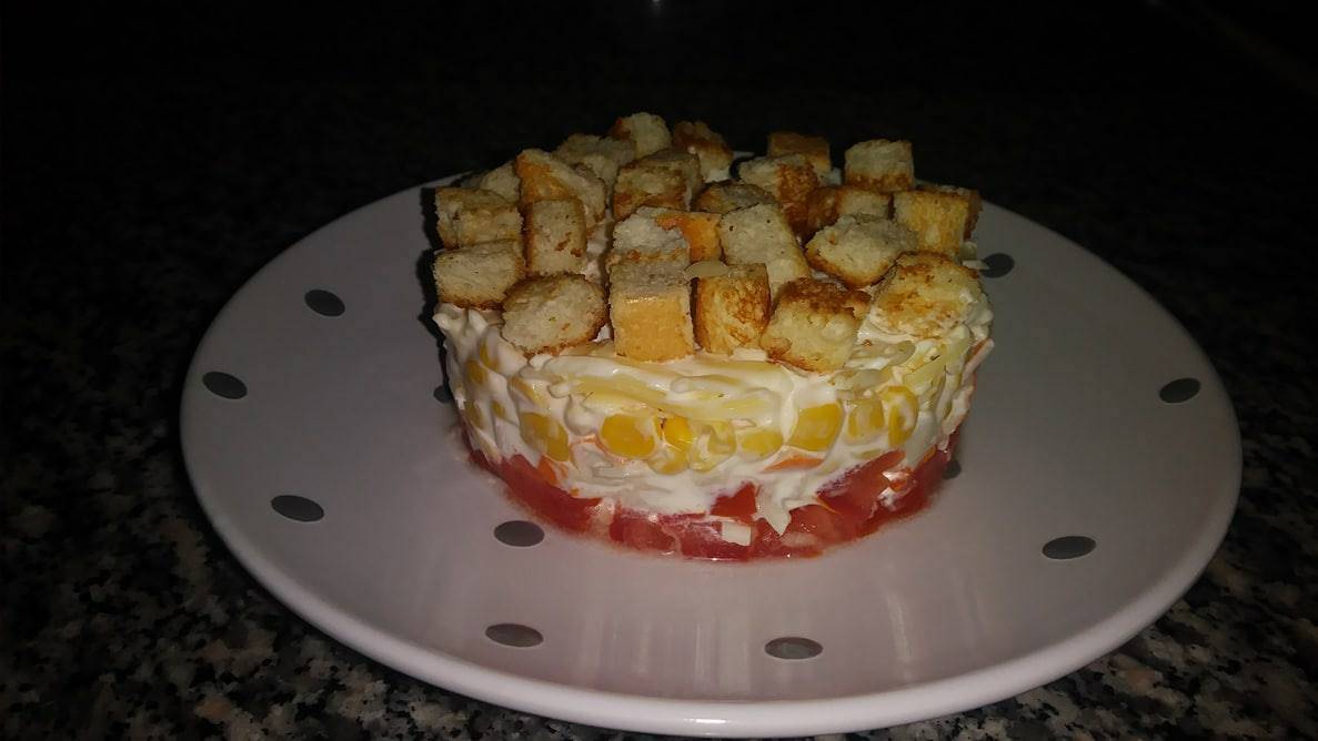 Дно плоского блюда смажьте майонезом, выложите первый слой салата из помидоров. Следом выложите слой из кукурузы.