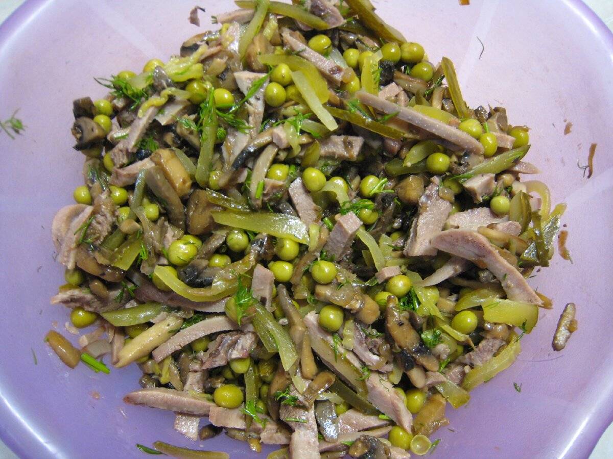 Первый рецепт — салат с языком, шампиньонами и маринованными огурцами