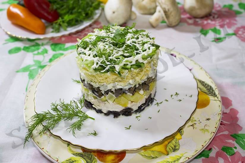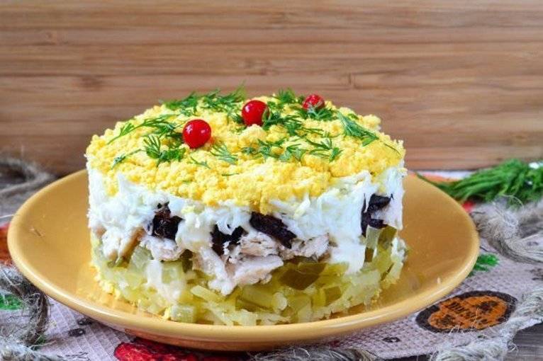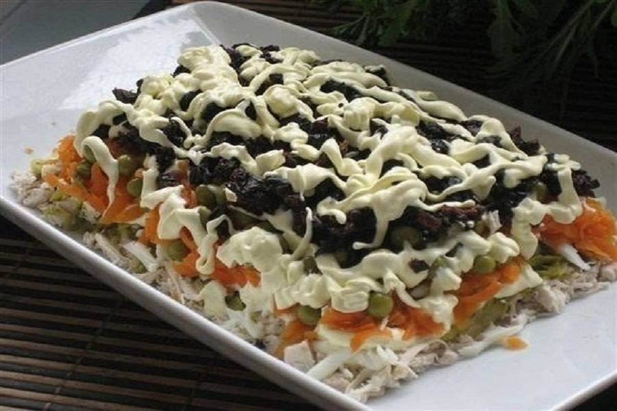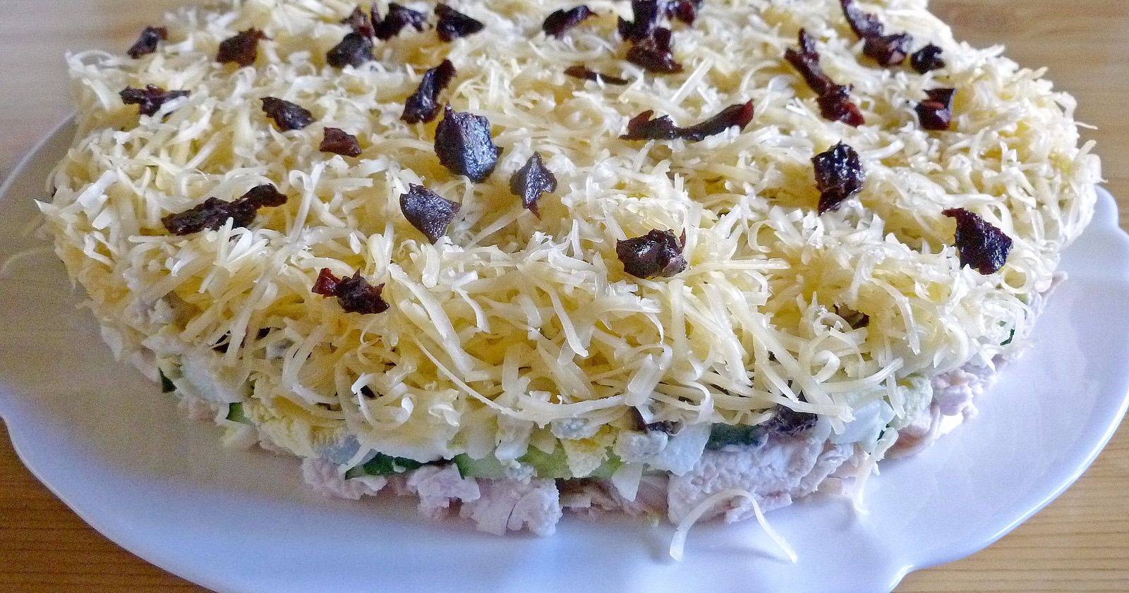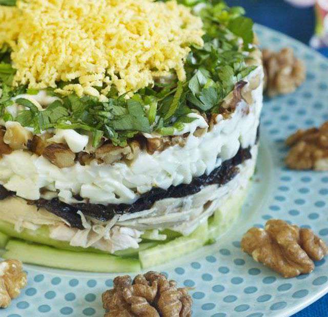 Этот салат с курицей, грибами и черносливом заправлен оригинальным соусом, приготовленным из майонеза и кефира. Такой соус подходит именно для слоёных салатов, т.к. благодаря своей консистенции он хорошо пропитывает каждый слой.