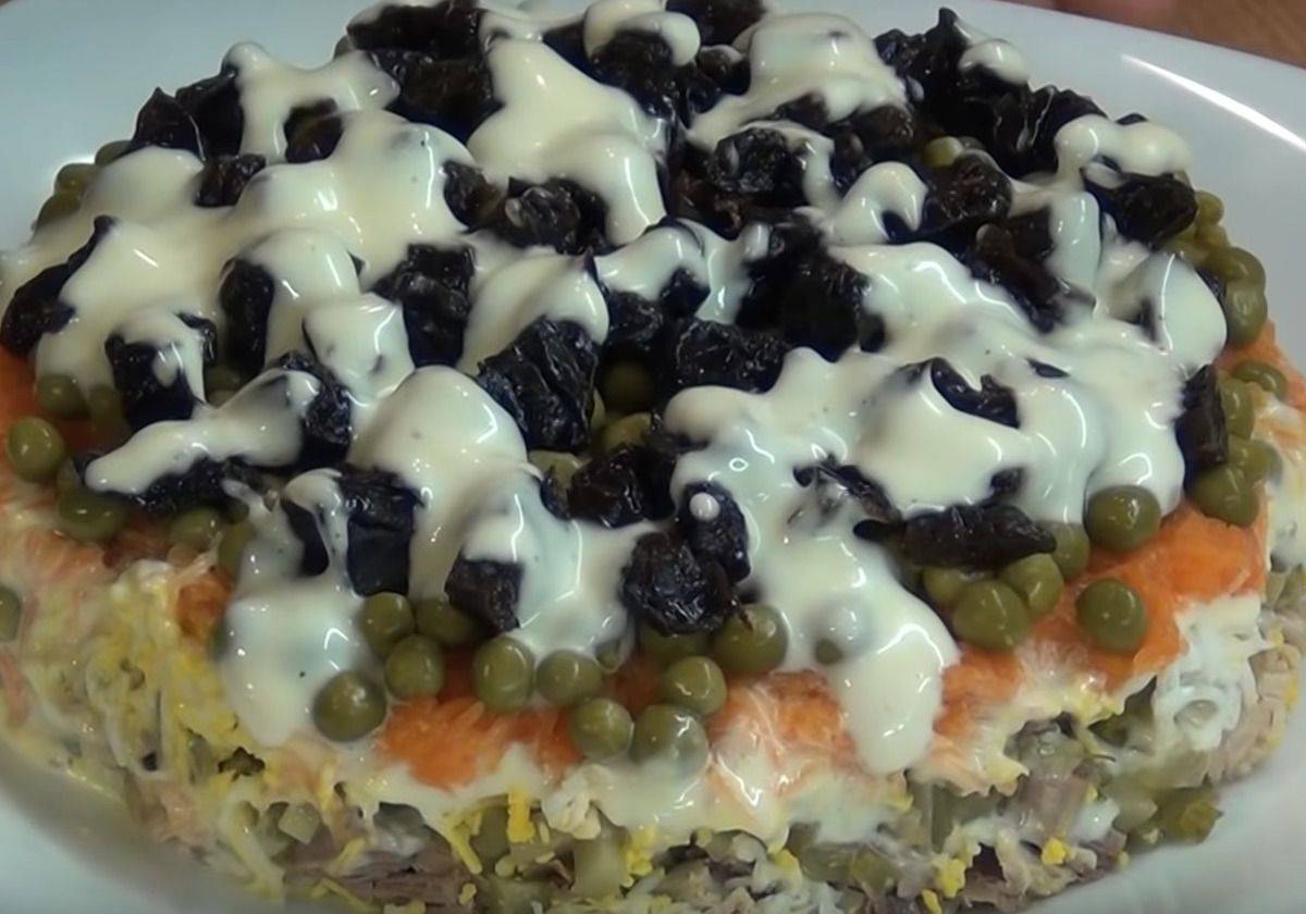 Тебе понадобится: 180 г отварной говядины, 3 вареных яйца, 180 г твердого сыра, 100 г чернослива, 3 маринованных огурца, 1 репчатая луковица, 90 г кедровых орехов, домашний майонез, 0,5 банки зеленого горошка.