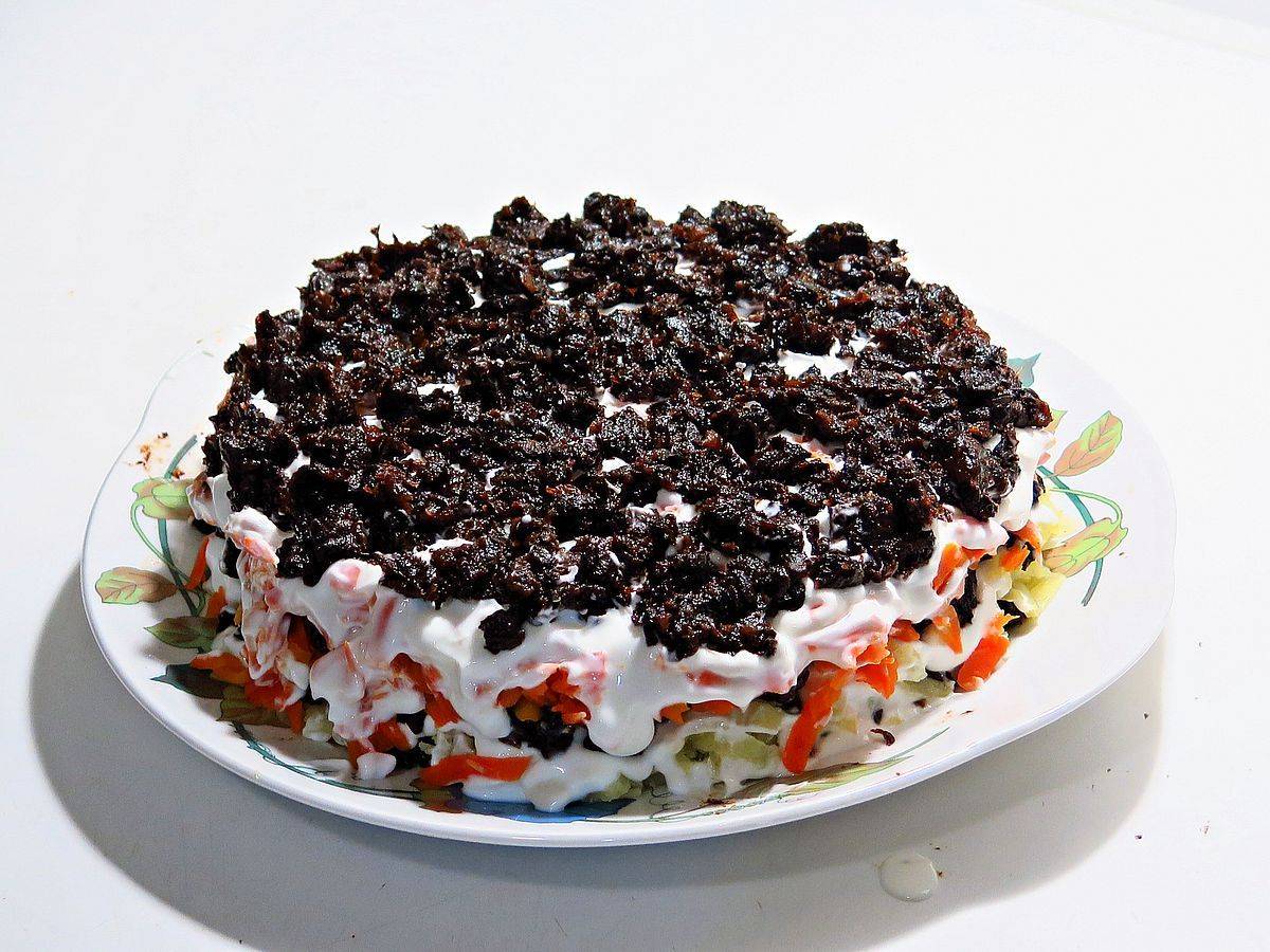 Приготовление: Слегка обмажь растительным маслом внутренние стенки и дно глубокой миски, застели листами пищевой пленки. Смешай натертые на терке яйца и сыр, несколько ложек смеси переложи в подготовленную миску, смажь майонезом. Далее собирай салат, выкладывая слои в центр, а по бокам, ближе к стенкам миски, насыпай бортик из яично-сырной смеси, перемазывая «этажи» салата майонезом.