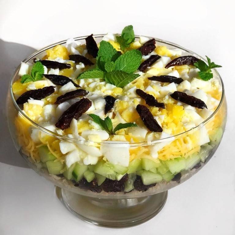 - Поверх блинчиков придаем цвета нашим салатикам, добавив понемногу чернослив, огурец, сыр и грецкие орехи.