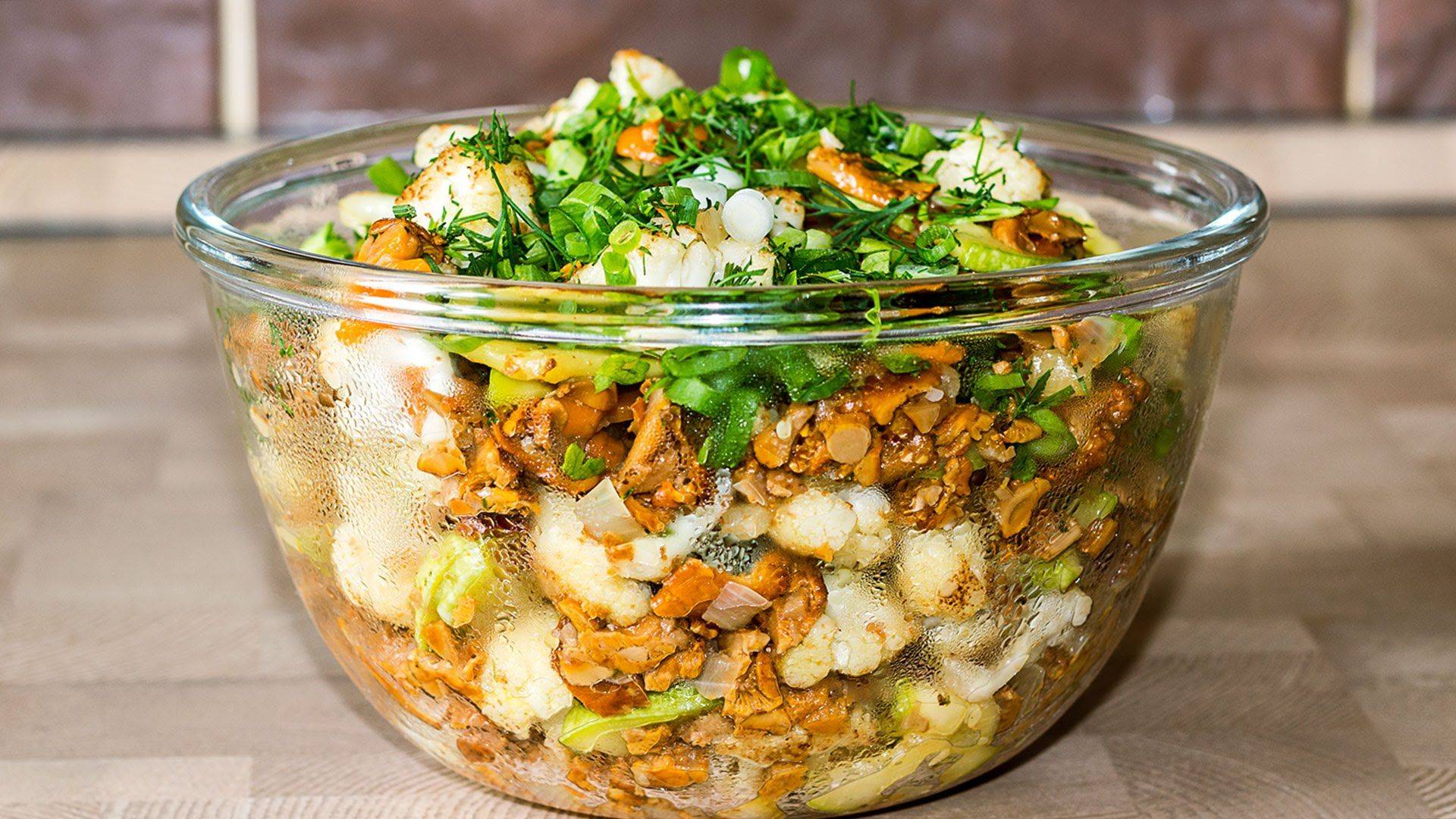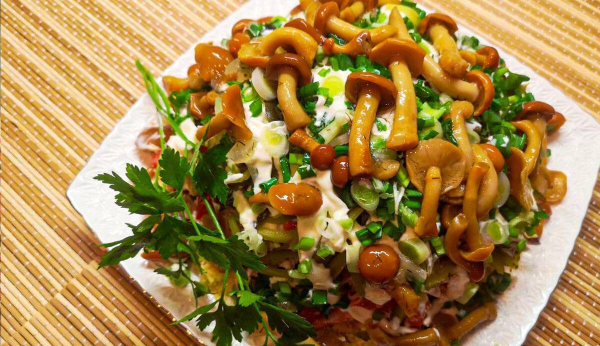 Вкусный салат с приятным грибным ароматом и ярким вкусом.