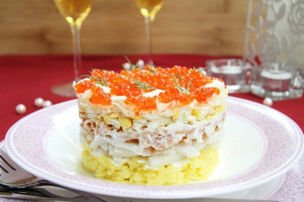 Рецепт салата с кальмарами и слабосоленой рыбой