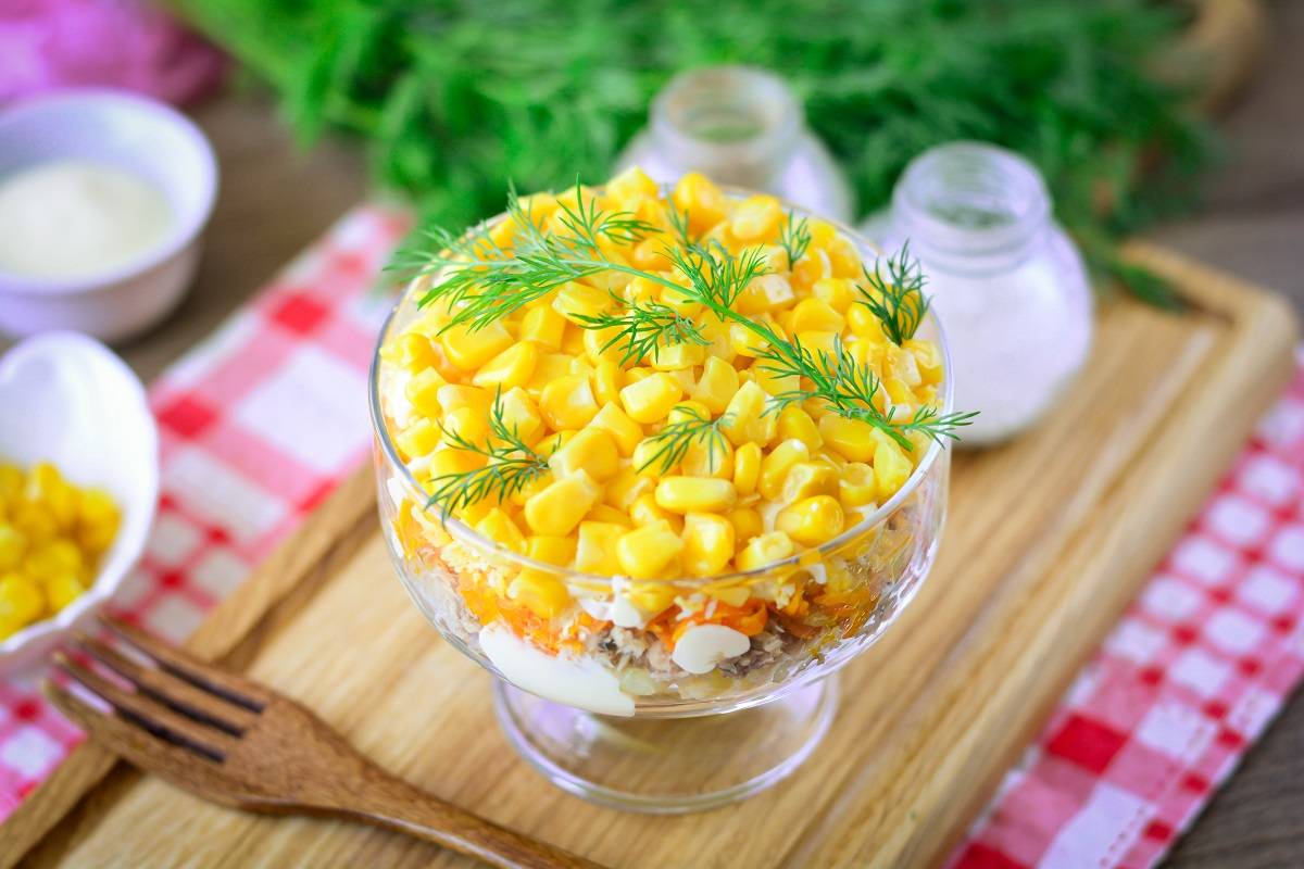 • кукурузу лучше всего брать уже консервированную. Подойдёт и отварная, однако вкус от этого может несколько измениться, причём не в лучшую сторону. А уж о сырых зёрнах и говорить не приходится;
