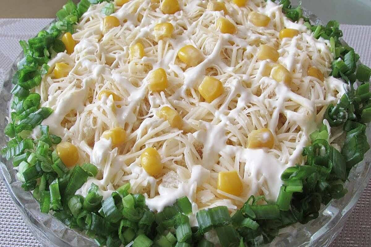Собирают блюдо слоями: Сначала укладывается филе, следом лук. Далее в таком порядке — кукуруза, крабовые палочки, перец. Все слои промазываются сеточкой майонеза. Последним слоем идет корейская морковь. Сверху готовое угощение украшают маслинами и зелеными веточками петрушки, либо укропа.