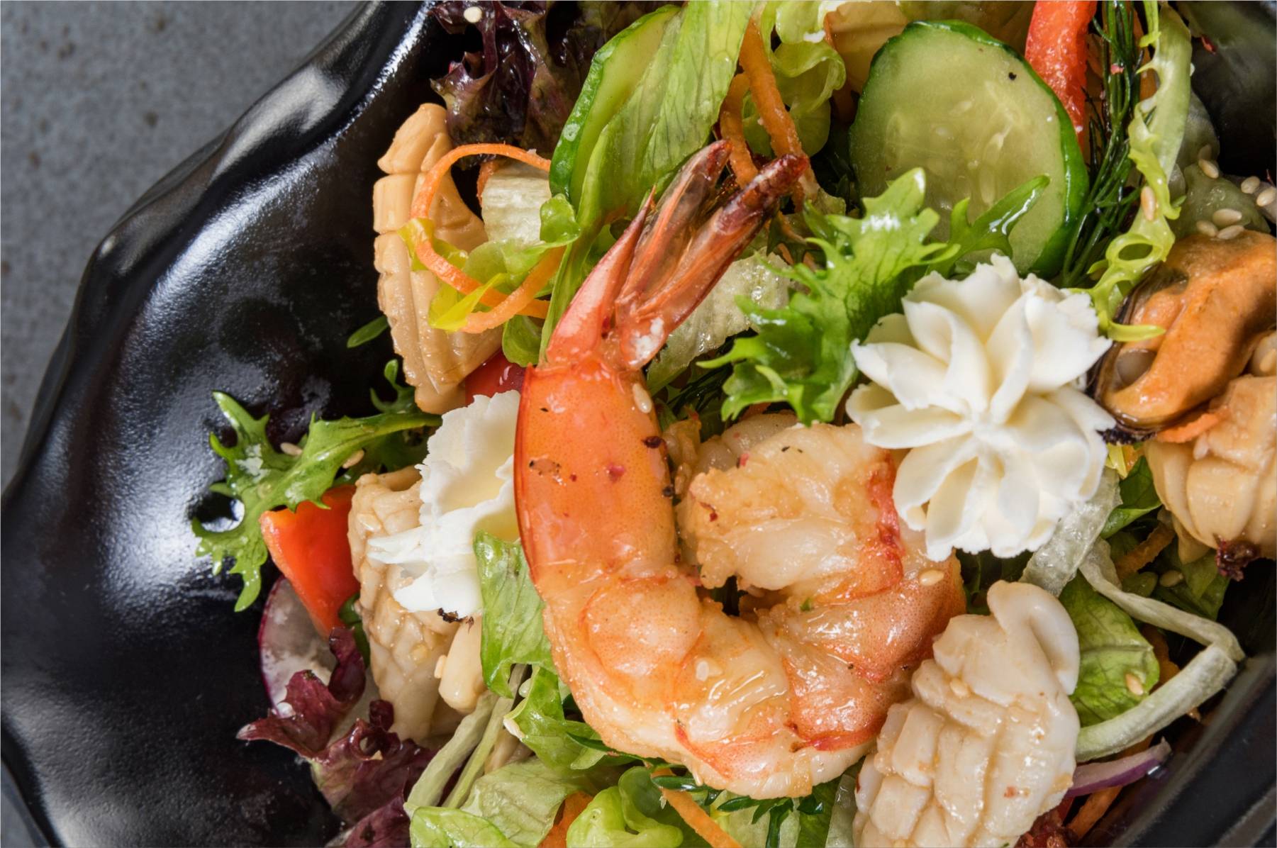 - Подают дары моря с овощным салатом, зеленью, подходящим соусом.