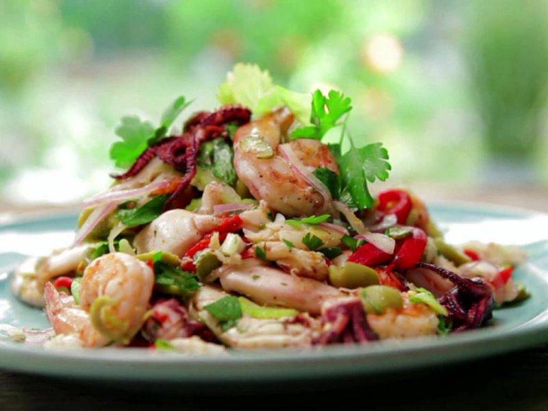 - Невероятно вкусны салаты с участием даров моря, заправить которые можно классической заправкой из масла и лимонного сока или майонезом.