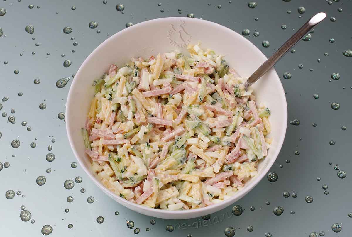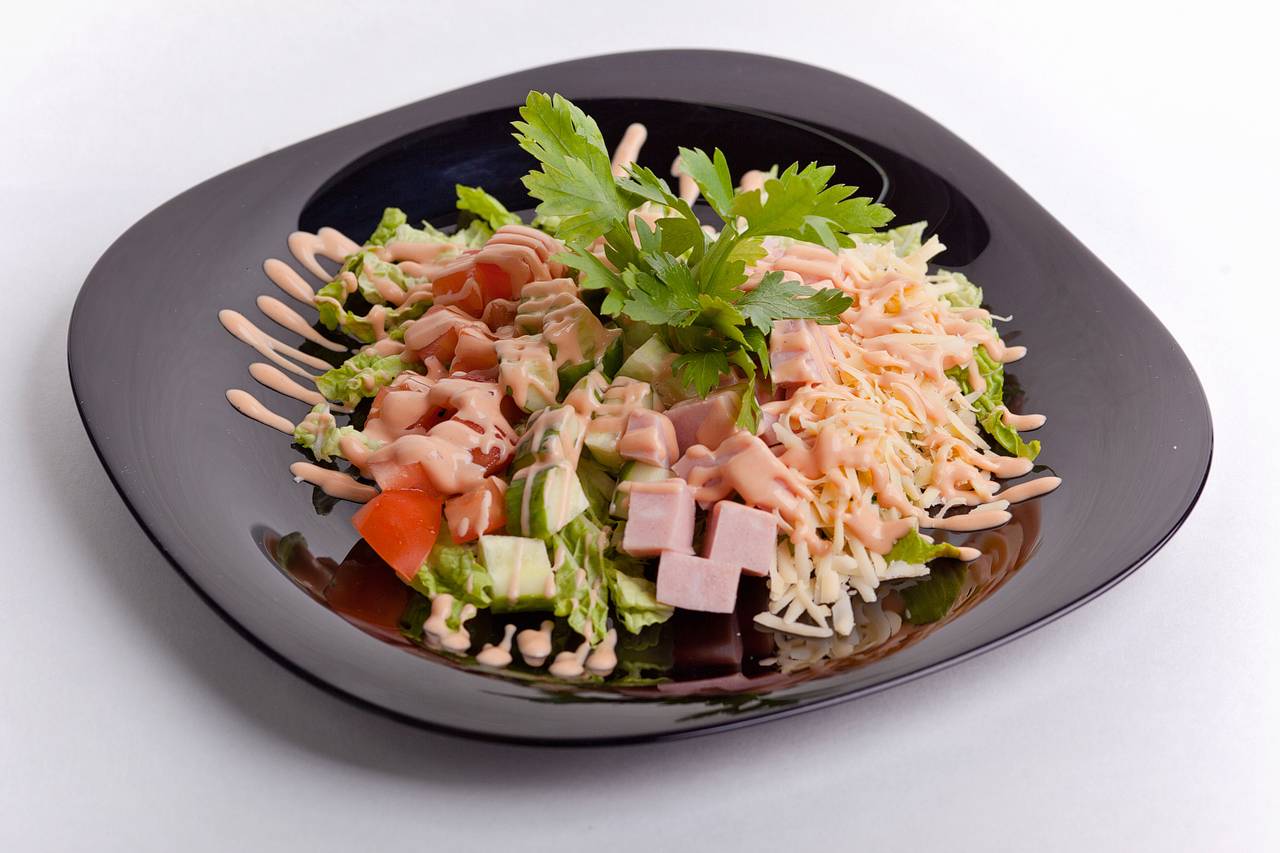 - Салат в классическом исполнении, с добавлением ветчины и свежего огурца, почти не содержит простых углеводов – главных виновников лишнего веса.