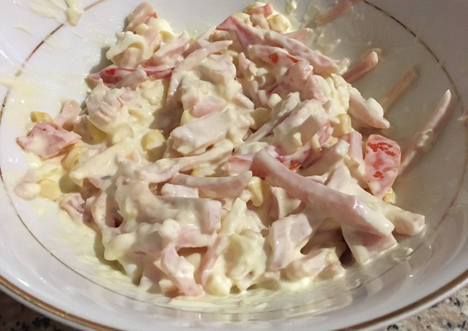 - Нарезать ветчину. Полученные кубики отправить к кукурузе и засыпать луком.
