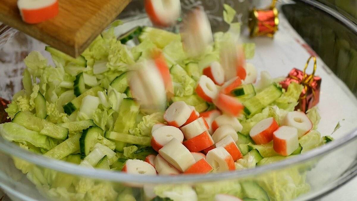 – Примечание: салат можно подготовить накануне праздника, а заправить майонезом непосредственно перед подачей на стол. Для этого необходимо поместить все нарезанные ингредиенты в пищевой контейнер с плотно закрывающейся крышкой и хранить в холодильнике.