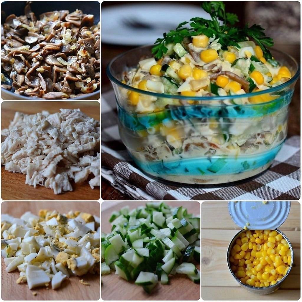 Салат «Зодиак» с курицей, шампиньонами и кукурузой — классический рецепт