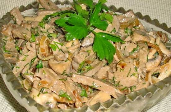 Гурманы считают, что салат «Зодиак» вкуснее с лесными грибами. И ради получения любимого вкуса согласны сильнее потратиться и дольше возиться – ведь добычу с «тихой охоты» обычно приходится еще и варить перед жаркой.