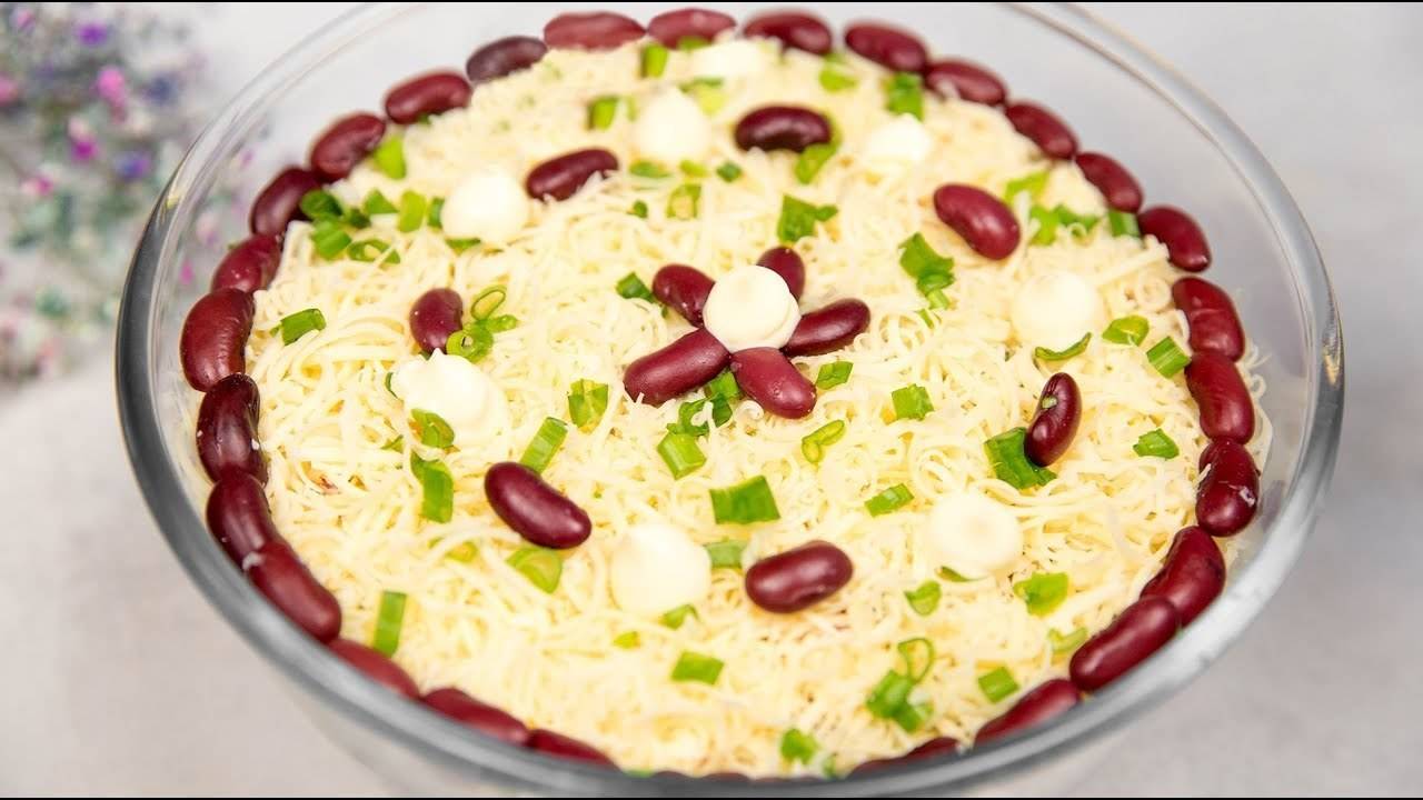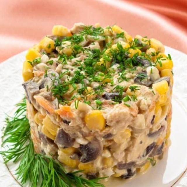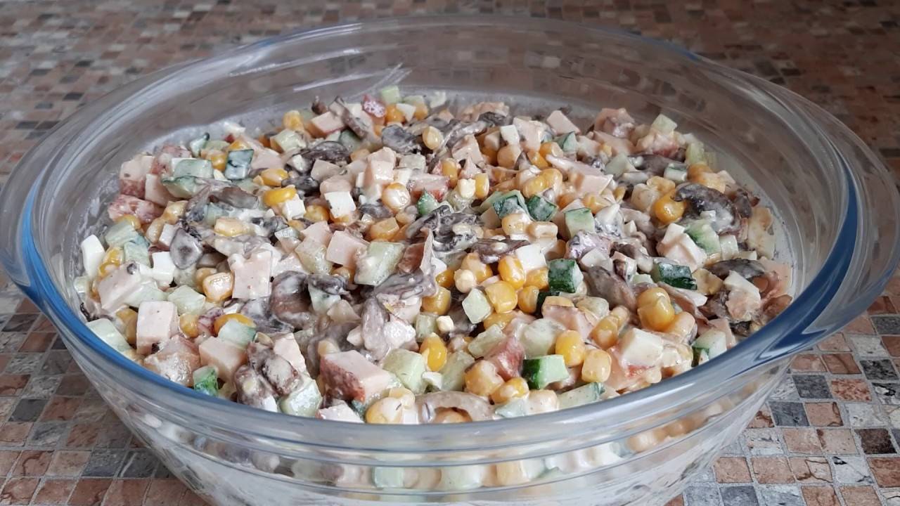 Классический салат «Зодиак» с шампиньонами, куриным филе и кукурузой