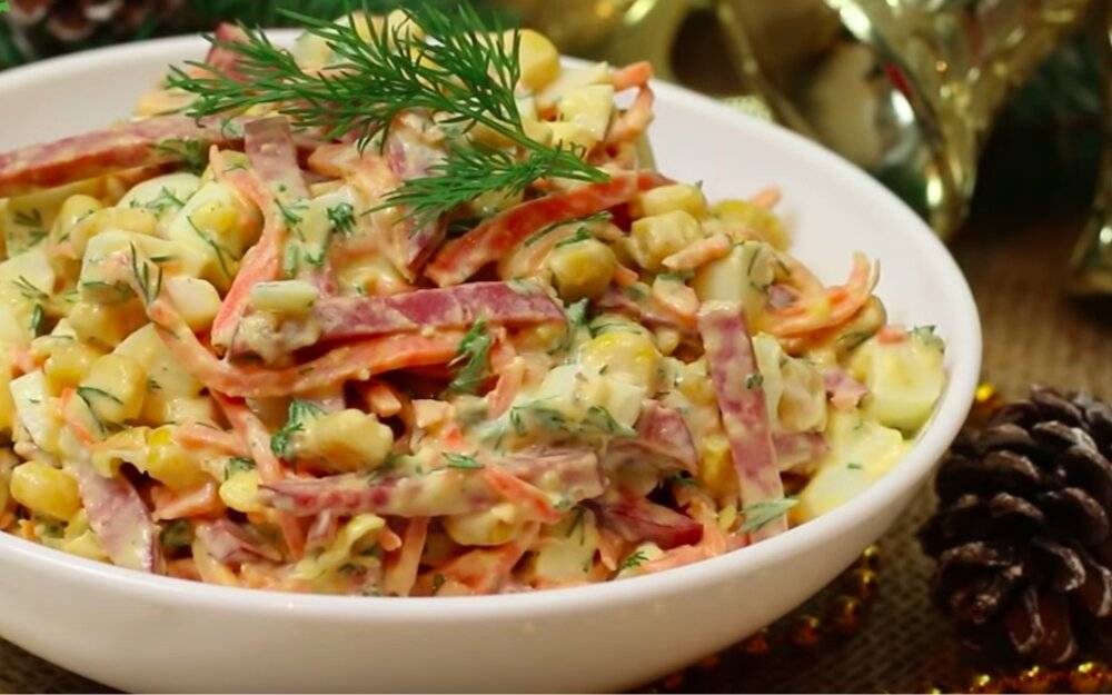 – В глубокой миске собрать салат: положить нарезанную колбасу, морковку по-корейски, измельченные вареные яйца, кукурузу и мелко нарезанный свежий укроп. Добавить майонез, хорошо перемешать. Салат готов!