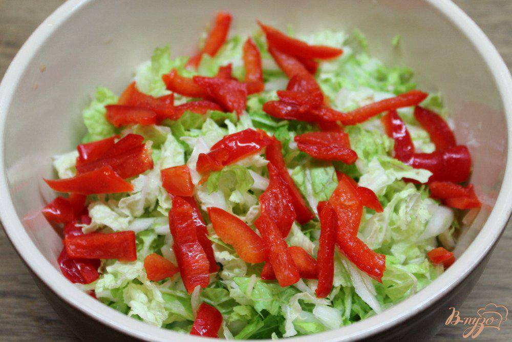 Пекинскую капусту порезать ножом, удаляя жесткую сердцевину. Добавить в салатницу.