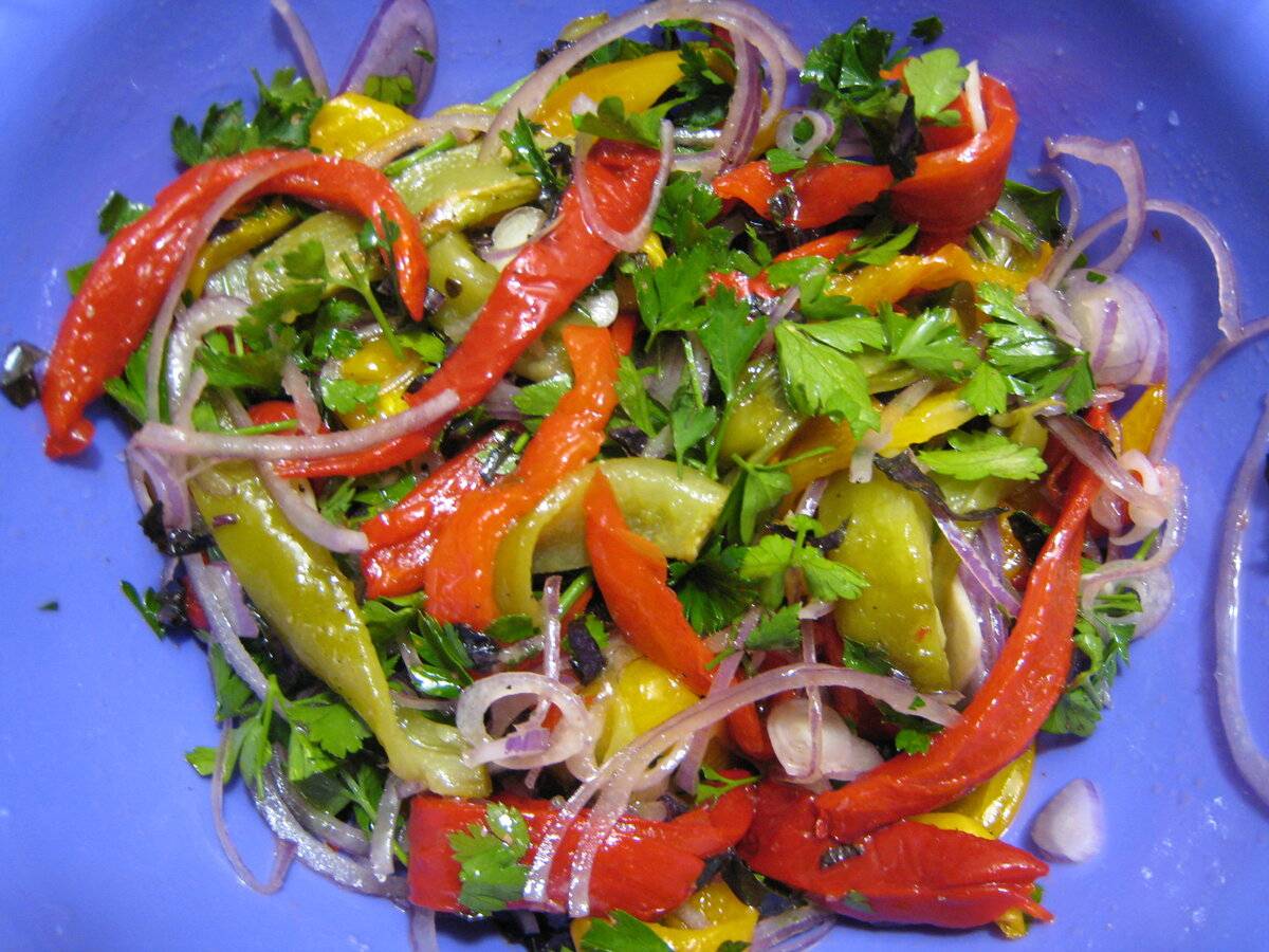 5. Аккуратно смешиваем в миске перец с чесноком, солью, растительным маслом, уксусом и зеленью петрушки, и подаем на стол.