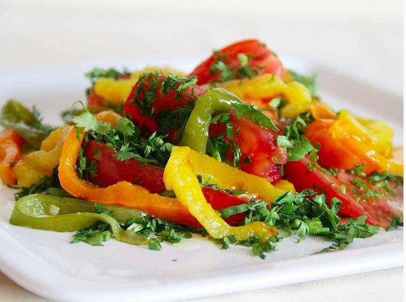- томаты + болгарский перец (слегка присолить и поперчить, а затем промазать небольшим количеством сметаны или майонеза);