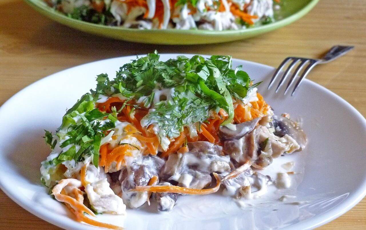 «Грибная поляна» с шампиньонами и корейской морковью и свежим огурцом – очень вкусно!