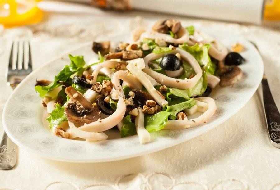 Помимо закуски с интересным названием «Грибная поляна» существует еще несколько разных вариантов, как сделать салат с шампиньонами слоями. В одном из них снова используется курица, но уже в сочетании с другими продуктами. Интересный вкус грибной салат приобретает за счет чеснока и грецких орехов. Для придания красивой формы стоит использовать специальное приспособление в виде цилиндра или что-то похожее на него. Сама технология приготовления представлена в пошаговой инструкции ниже.