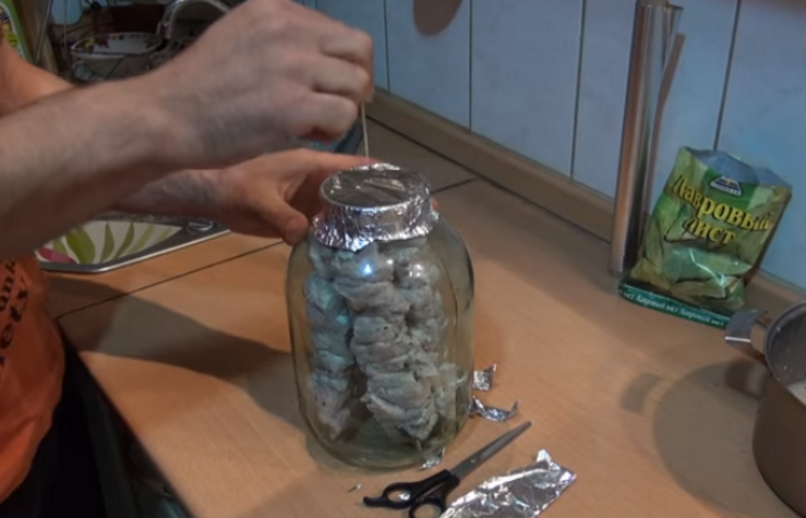 - В сухую трехлитровую банку помещаем палочки уже с обжаренным мясом. 4-5 штук достаточно. Накрываем горлышко банки фольгой;