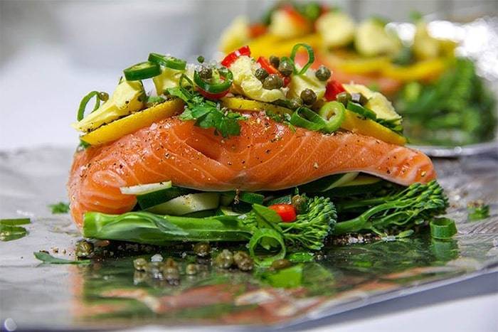 Идеальный вариант диетического ужина — это стейк семги, запеченный в фольге с овощами. Это одновременно и горячее блюдо, и сразу гарнир к нему. Мягкий, но слегка пикантный вкус, который обеспечивает смесь острых приправ — орегано, чеснок и перец с кориандром. Сделайте блюдо еще привлекательнее, добавив разноцветные овощи. Получится вкусно и красиво, кроме того — низкокалорийно. Еда подойдет тем, кто соблюдает диету.