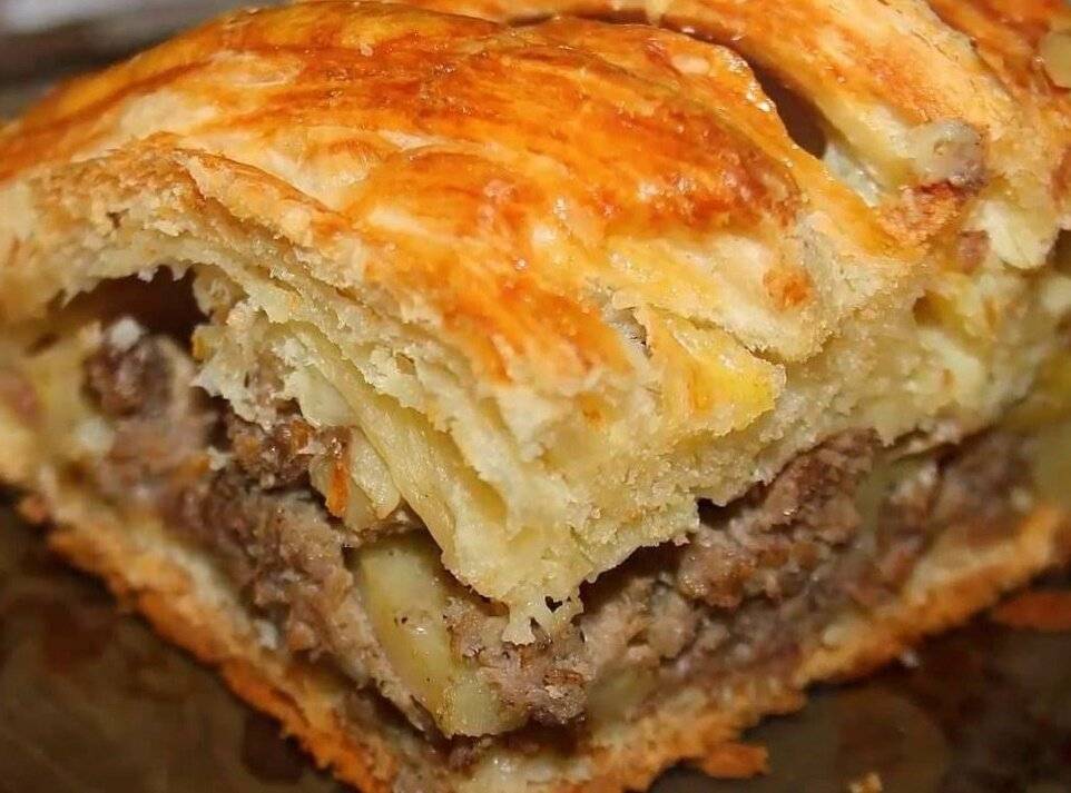 Пирог из слоёного теста с мясом и картошкой