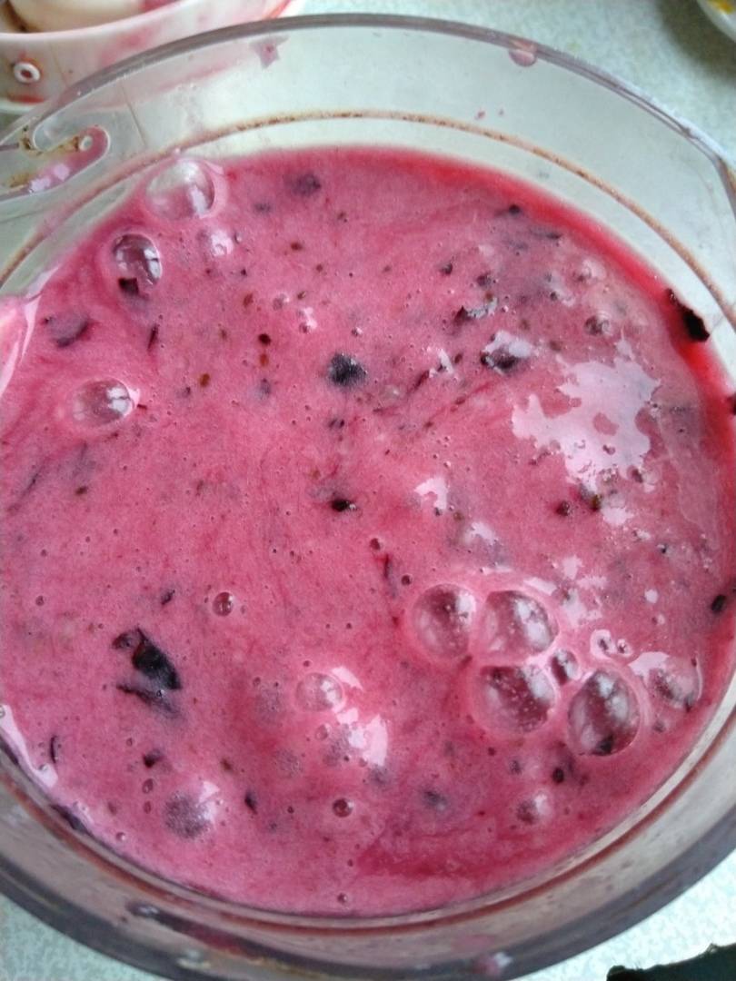 - В блендере измельчить яблоки, затем всыпать ягоды и продолжить взбивать. Если масса получается слишком густая и плохо взбивается можно влить немного холодной минеральной или кипяченой воды.