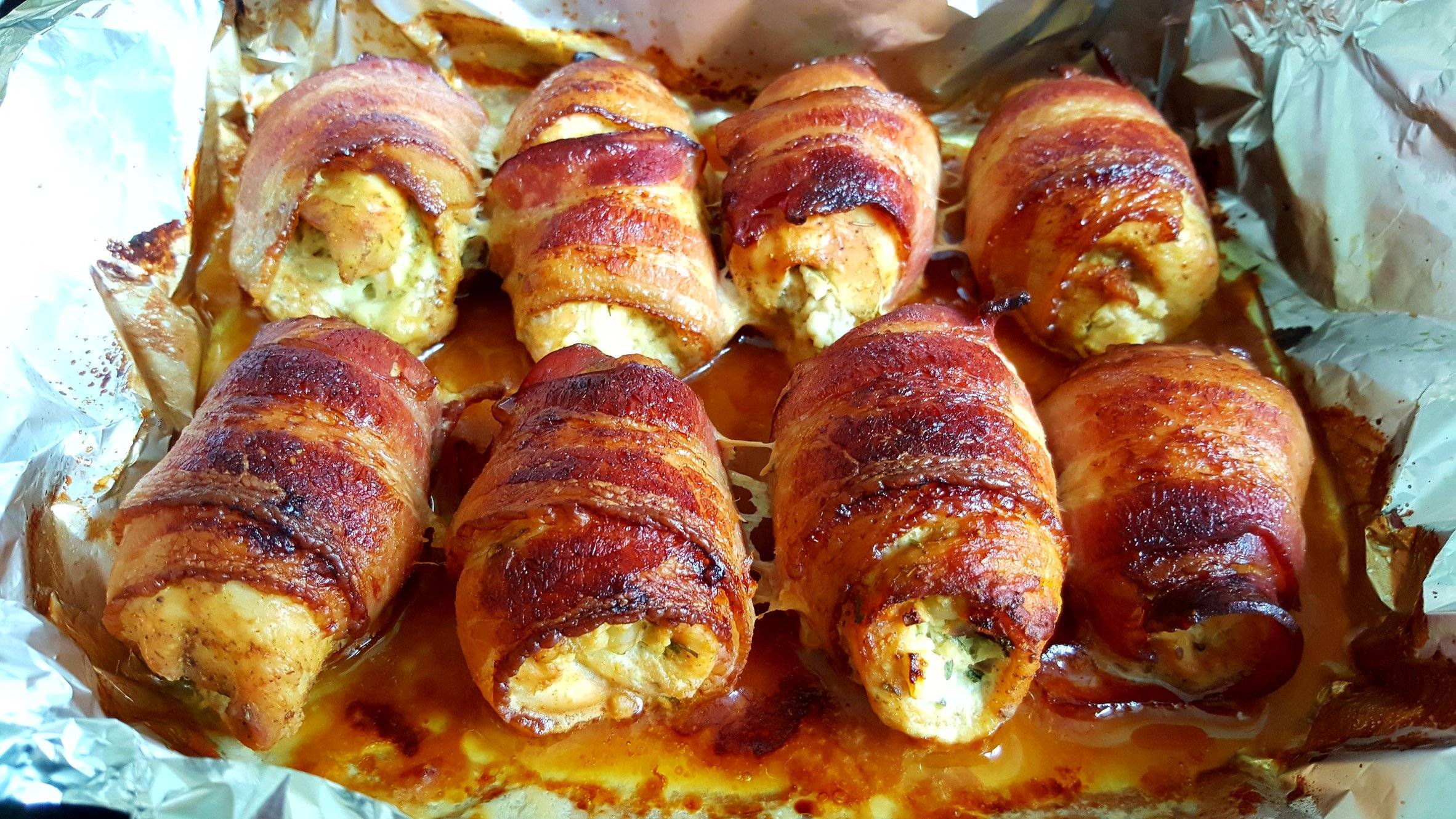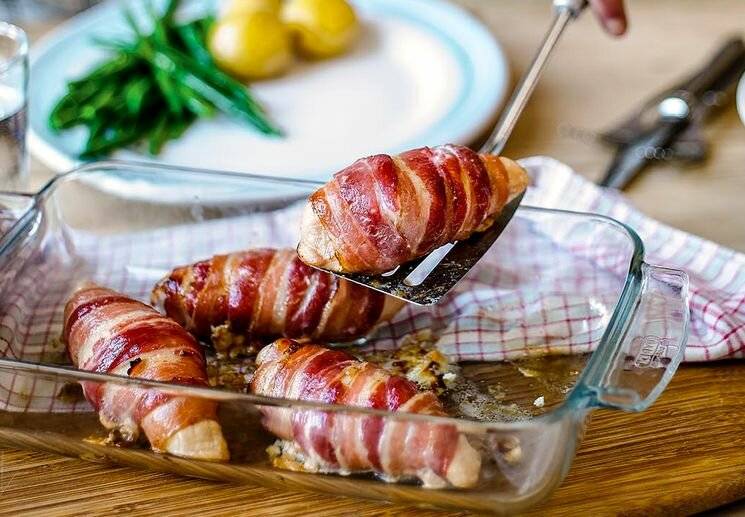 Из бекона можно приготовить очень вкусные рулетики с самыми разными начинками. Такие рулеты можно жарить на сковородке, но особенно вкусными они получаются запеченными в духовке. В качестве основы для начинки подойдут грибы, курятина, говядина, индейка, любой мясной фарш. Можно также задействовать сыр, помидоры, лук, любые ваши любимые специи.