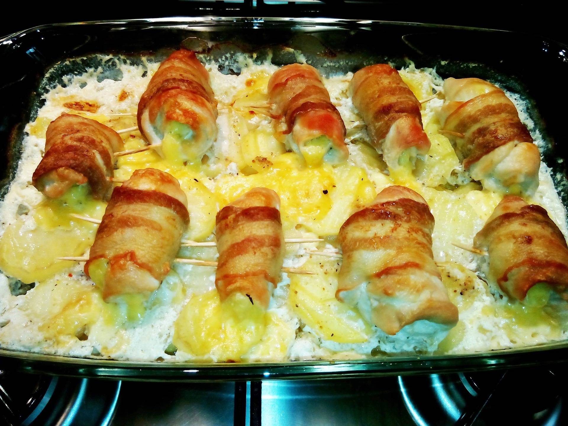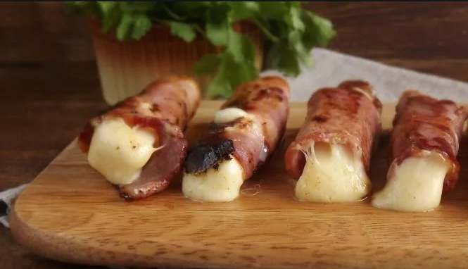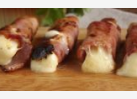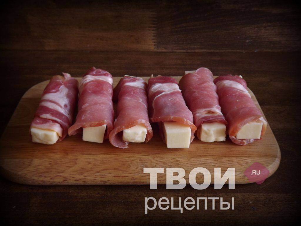 - Солим и перчим отдельно каждый кусочек бекона. Выкладываем начинку на полоску бекона и сворачиваем рулетик. Если рулеты разворачиваются или рассыпаются, можно обвязать их нитками.