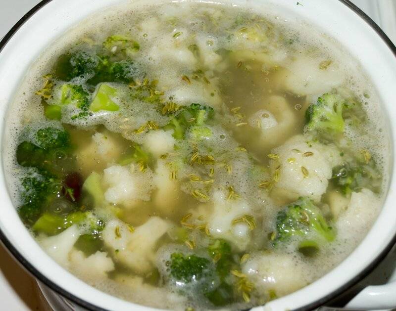 - Разделите суп на 2 части: в одну поместите цветную капусту, в другую – брокколи.