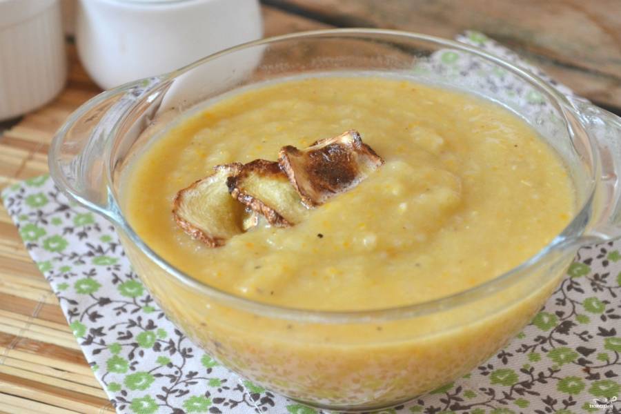 Идеальным дополнением для любого супа-пюре являются сухарики. Их можно купить либо приготовить самостоятельно. Украшать ими блюдо нужно непосредственно перед подачей либо подавать в отдельной мисочке.