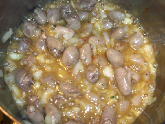 - Подготовить сердечки: промыть, убрать пленки с прожилками (они придают не сильно приятный вкус и аромат, делают готовый продукт жестковатым). На этом этапе можно разрезать каждое сердечко на три части, промыть и замариновать в измельченном луке.