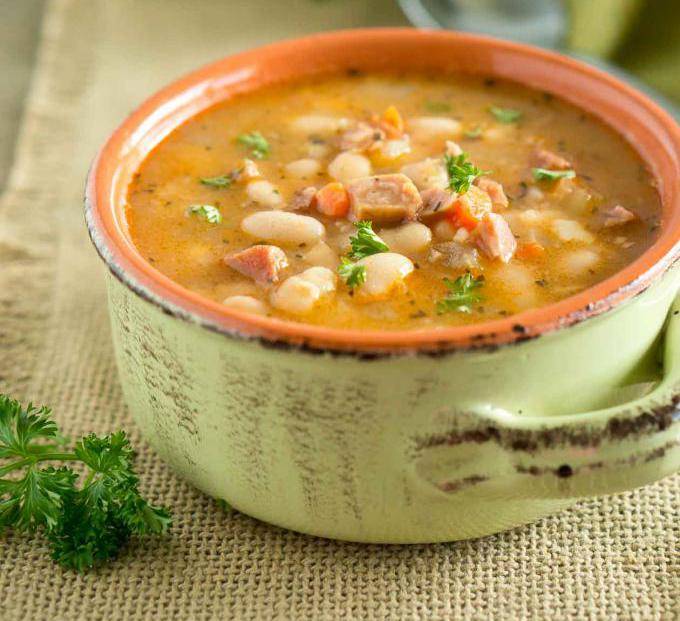 Соленый, с привкусом копченостей, очень ароматный – этот восхитительный суп кто-то зовет гороховым, кто-то фасолевым. Однако суть неизменна: он невероятно вкусный и согревающий, поэтому идеально подходит для зимнего обеда. Приготовление такого супа фасолевого с мясом не вызывает сложностей. Копченостями могут выступать ребрышки баранины, кусочки курицы, бекон, сухая колбаса. Возможна замена их на тушенку.
