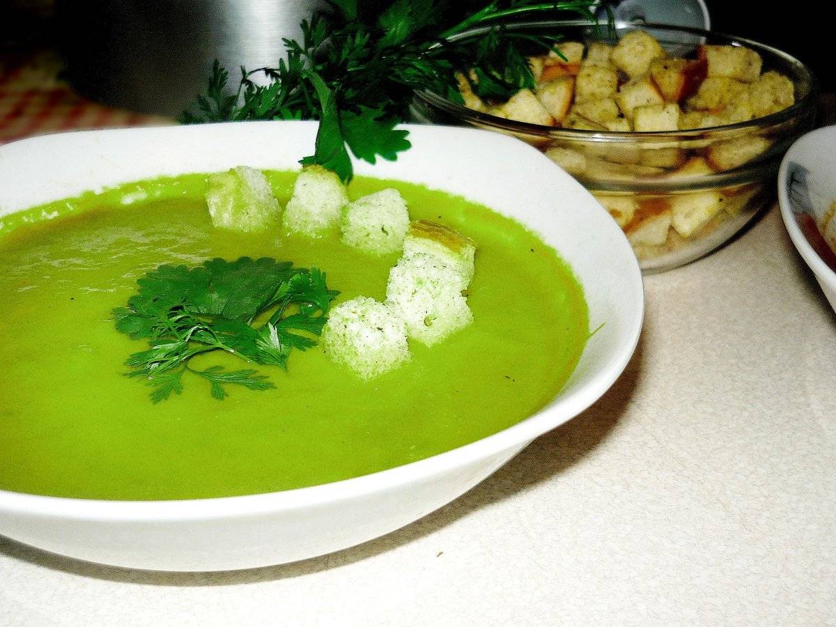 Этот нежный суп со сливочным вкусом готовится не из сухого, а из зелёного горошка. Мясная составляющая рецепта — свиные рёбрышки, но это необязательно. Очень вкусно получается на курином бульоне.