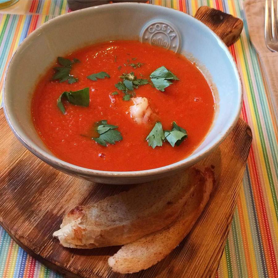 По сути этот суп — томатный сок, обильно наполненный специями, приправленный тертым итальянским сыром и ароматным оливковым маслом. Креветки и сухарики — его основное наполнение. Он легкий и питательный, вкусный как в горячем, так и в холодном виде.