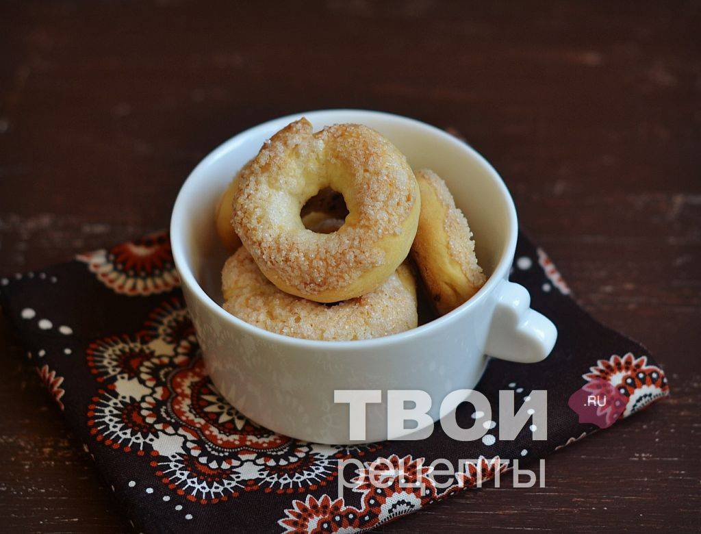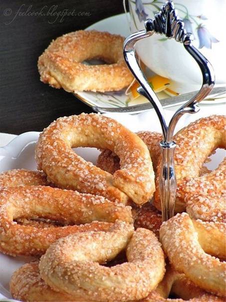 Когда тесто в последний раз настоится, выкладываем его на, притрушенный небольшим количеством муки, кухонный стол и снова хорошо его вымешиваем руками в течение 1-2 минут.После этого с помощью ножа разрезаем тестовый кусок на небольшие кусочки, чтобы с ними было легче работать. И теперь из каждого кусочка руками формируем тоненькую «колбаску», диаметром примерно 1 сантиметр. Ножом разрезаем каждую колбаску на небольшие жгутики размером 4 — 5 сантиметров.Из каждого жгутика формируем овальные крендельки и пока что откладываем в сторону. Когда все печенье будет сформировано, высыпаем в пиалу сахар, и каждый крендель обваливаем в нем со всех сторон.Сразу же после этого застилаем противень бумагой для запекания и выкладываем печенье на небольшом расстоянии друг от друга. Выпекаем блюдо в духовке в течение 15 минут при температуре 180°С до появления не его поверхности золотистого цвета.По истечении отведенного времени достаем противень с помощью кухонных прихваток и отставляем в сторону остывать на 15-20 минут.
