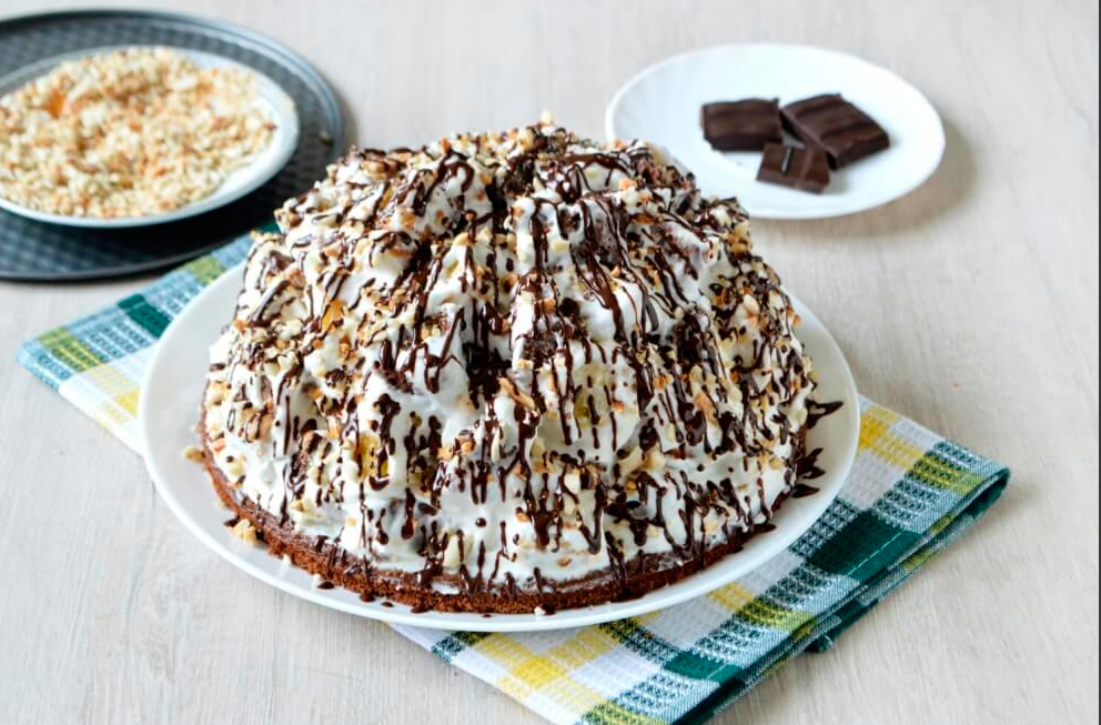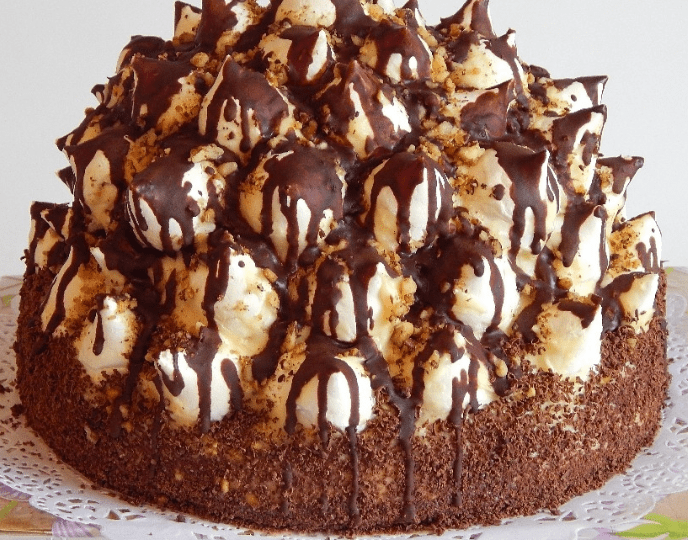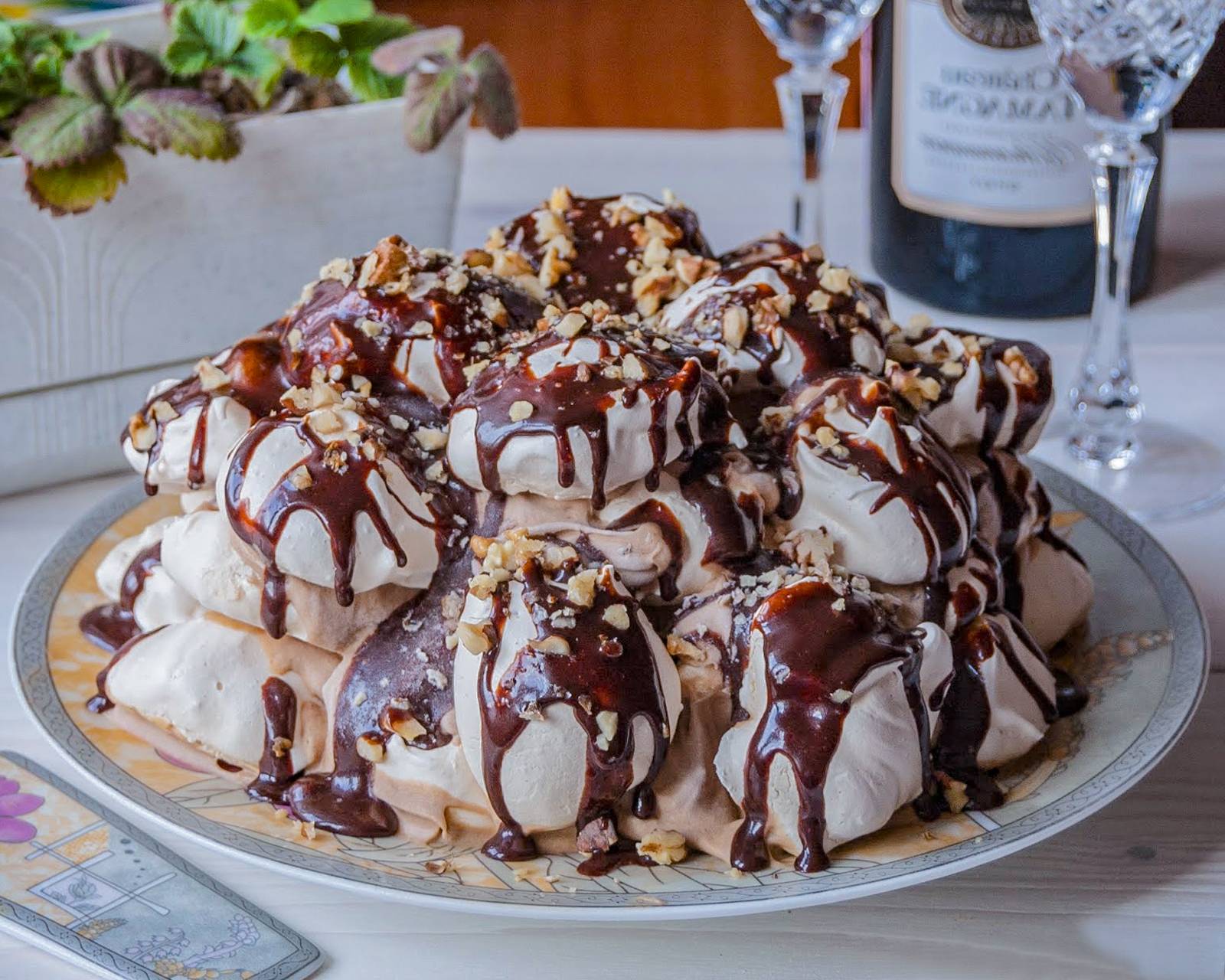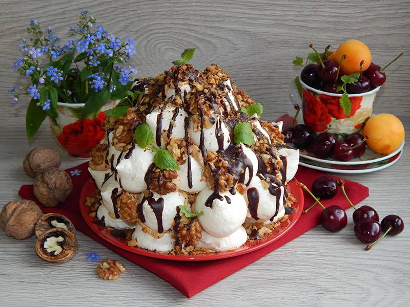 - Когда все составляющие торта будут готовы, соединяем их в горку. Для этого каждое безе смазываем кремом и выкладываем. Сверху торт поливаем точно такой же шоколадной глазурью и посыпаем все это грецкими орехами.