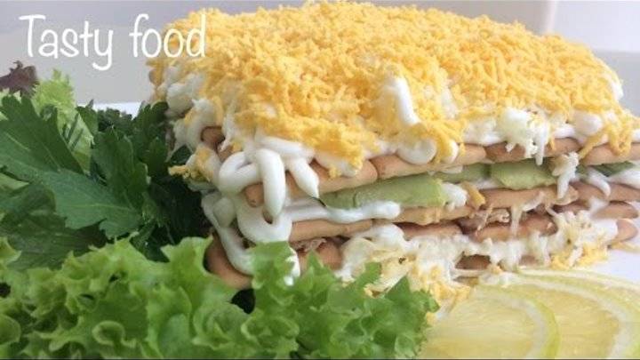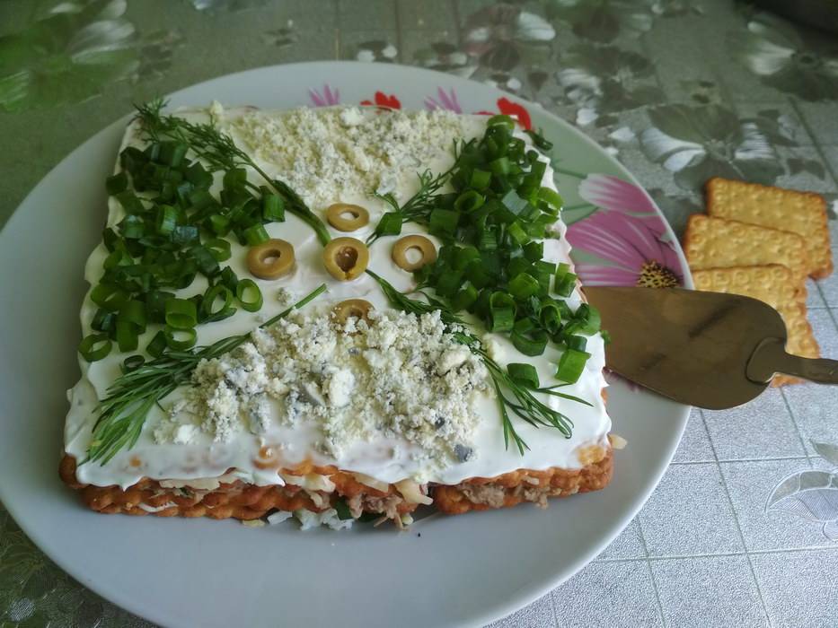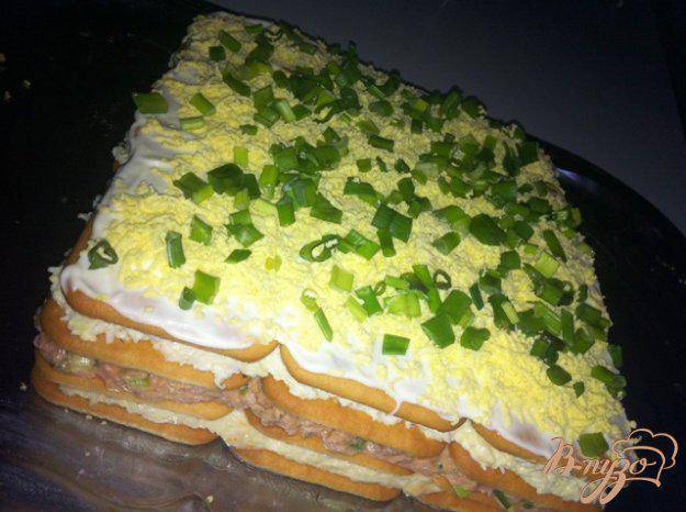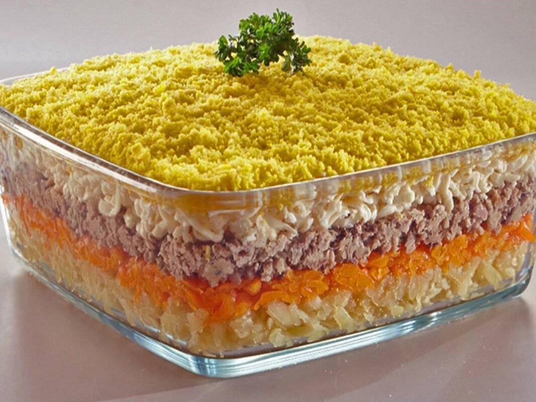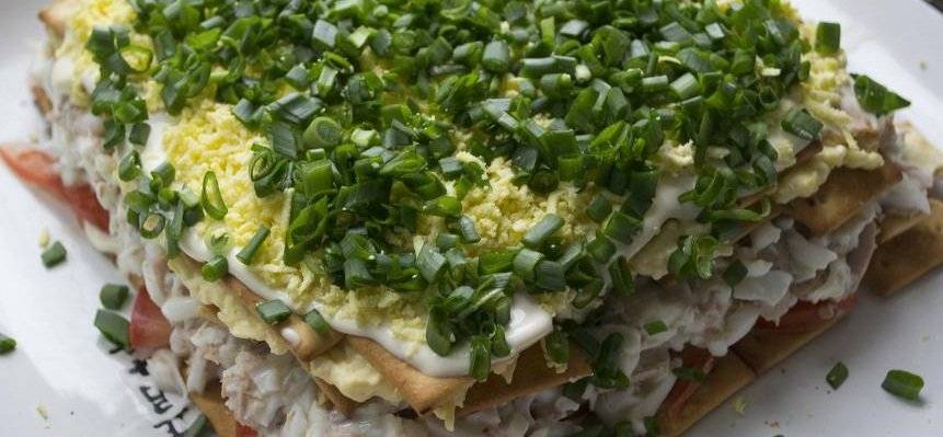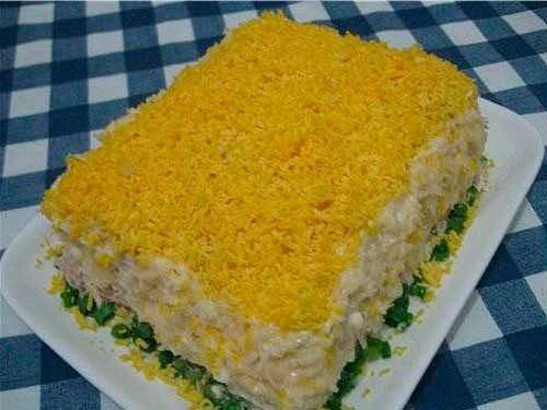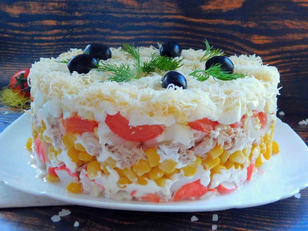 Слоеный салат с тунцом, сыром и кукурузой