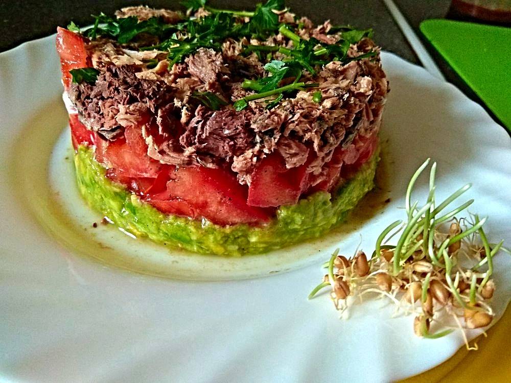 Свежий, оригинальный с чесночным вкусом салат из авокадо можно подать на ужин и к праздничному столу вместо приевшейся селедки под шубой. Любители легких рыбных салатов оценят.