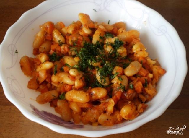 Фасоль прекрасно сочетается с любым мясом или рыбой. Данный вид блюда можно кушать в пост и подавать для вегетарианцев.