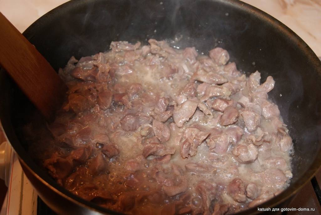 - К овощам сбрасывают желудки, обжаривают все вместе 6 мин.