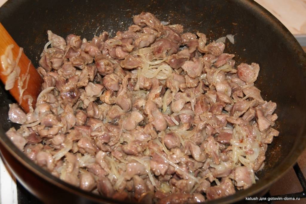 - Оставшуюся луковицу нарезают полукольцами, обжаривают на растительном масле до золотистого цвета, затем лук убирают, слегка обжаривают в оставшемся масле желудки.
