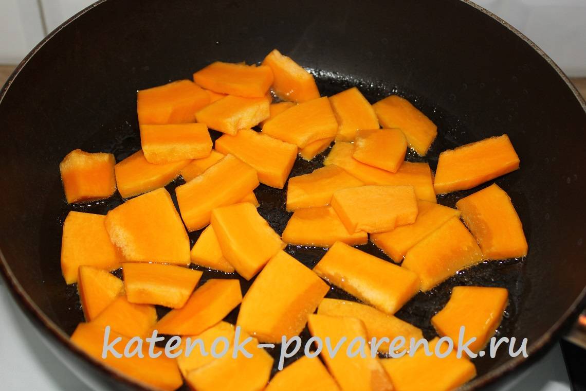 - Очищенную тыкву нарезают крупными кубиками или брусочками и подрумянивают в раскаленном масле до румянца.