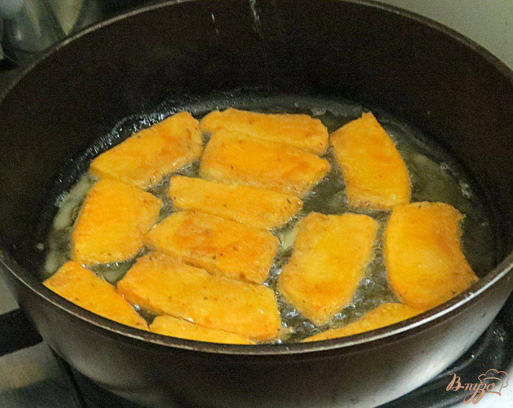 5. На небольшом огне раскалите растительное масло и опустите в него кусочки тыквы, после того как обмакнёте их во взбитое яйцо.