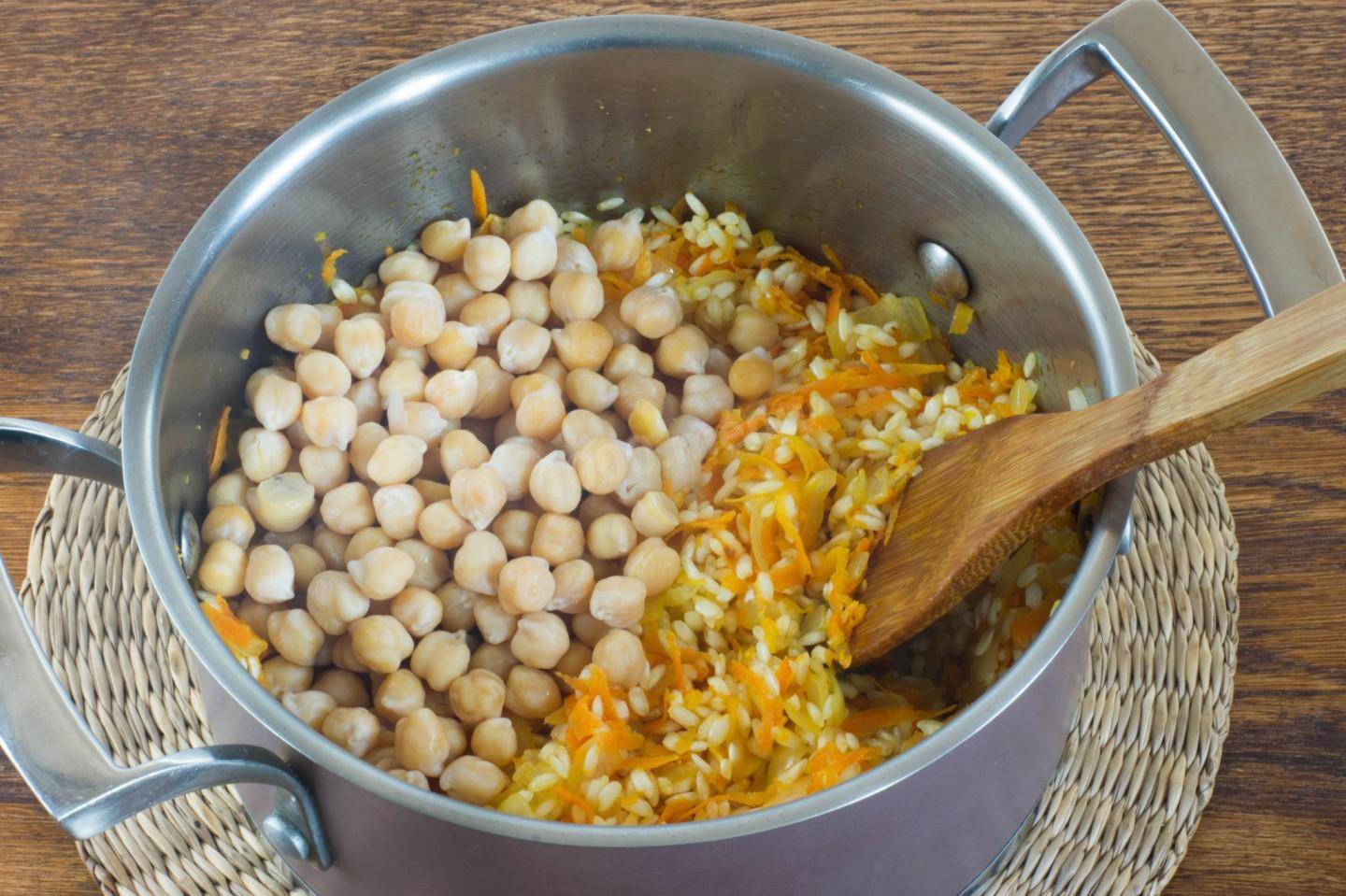 Нут в вегетарианском плове точно не успеет провариться и будет сырым, если его предварительно не замочить на сутки. Воду меняют три-четыре раза.